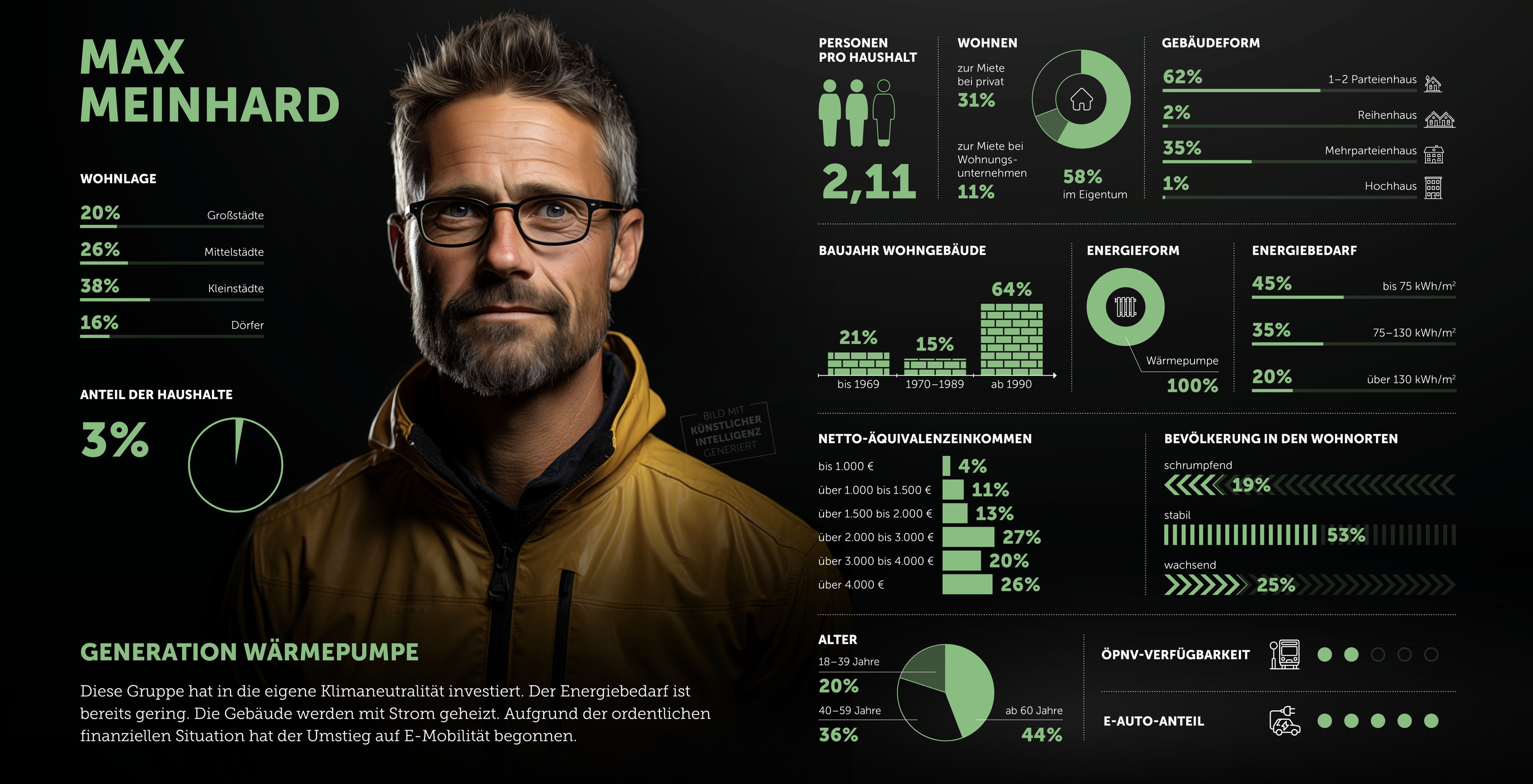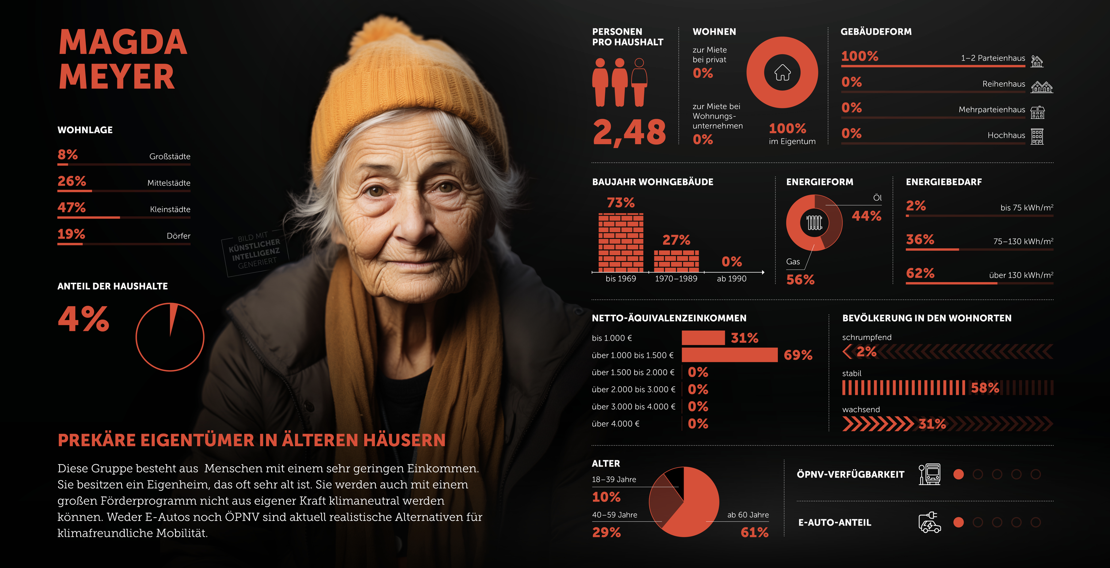 Die Voraussetzung für eine soziale Klimapolitik ist ein klares Bild von den unterschiedlichen Lebensrealitäten im Land. Es braucht differenzierte Lösungen, um die sich daraus ergebenden unterschiedlichen Herausforderungen zu adressieren. Dafür wurden für Sachsen Anhalt 14 Personas auf Basis eines umfassenden Datensatzes der infas 360 entwickelt. Dieser Datensatz enthält relevante Informationen zu Einkommen, Alter, Energiebedarf oder dem Anteil von E-Autos zu allen Wohngebäuden in Deutschland. Bei dem verfolgten Persona-Ansatz wird ausgehend von diesen Daten das fiktive Profil einer Person detailliert ausgearbeitet. Sie steht somit beispielhaft für eine relevante Lebenslage.